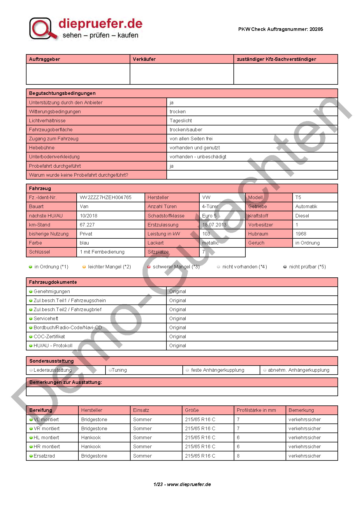Sie können dies natürlich auch den Profis überlassen: Gebrauchtwagen Schnappschuss von diepruefer.de (Link). Wir checken auch die Papiere!